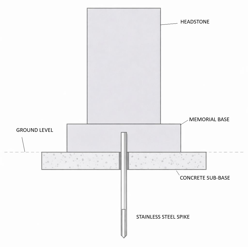 The headstone is also attached to the base with dowels. These are slightly smaller, and their size varies depending on the memorial’s overall dimensions. 16mm diameter would be standard. These are also threaded which adds to the stability of the headstone while also enabling a slightly smaller size. A dowel can’t be so thick that it affects the monument’s internal integrity and the threading helps with this as well. As mentioned, all of the metal used is stainless steel which prevents degradation and warping, even underground.